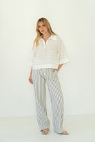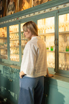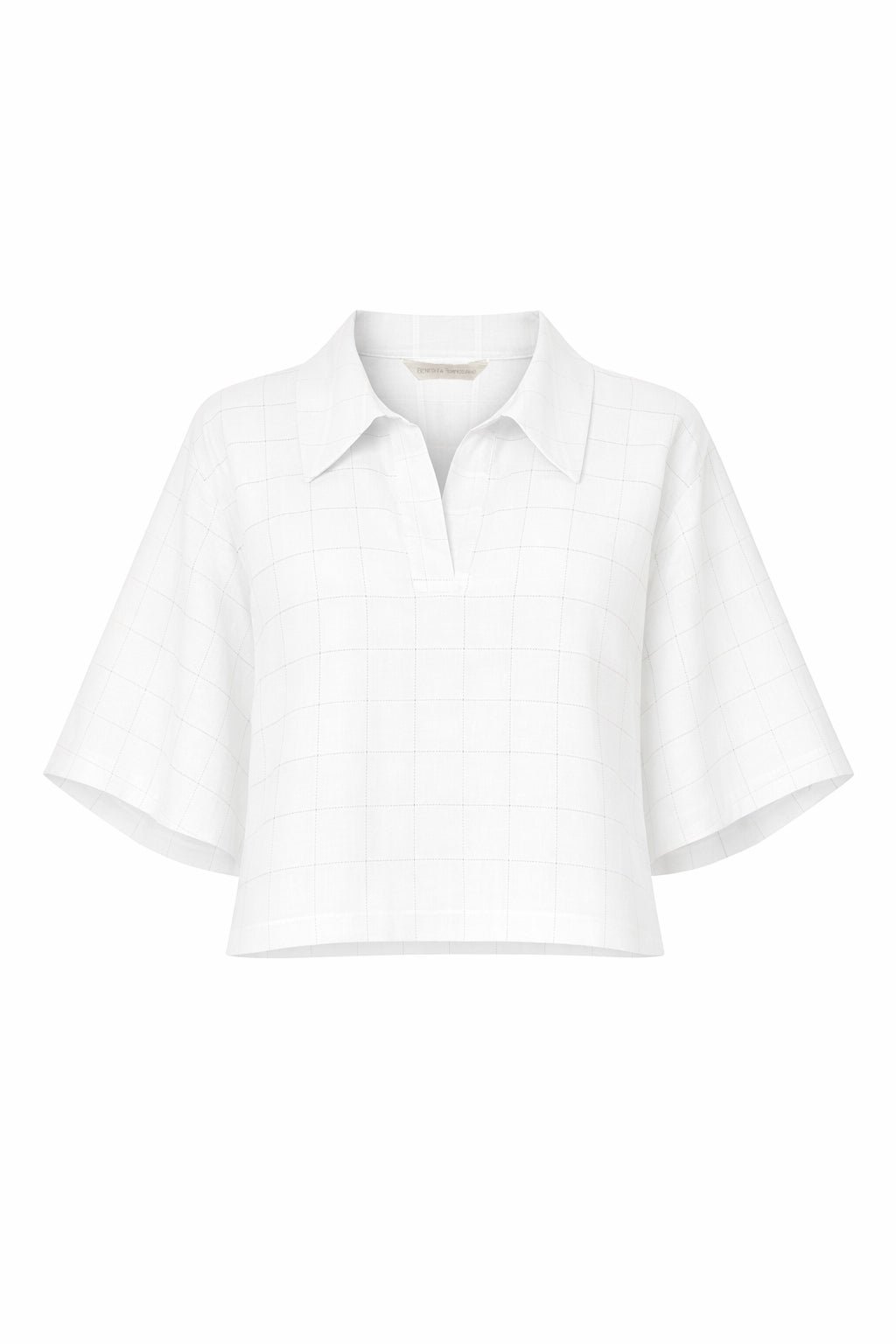 Blusa de manga curta em tom branco Alentejo num tecido delicado e padrão discreto de quadrados delimitados por ponto ajur entre o linho e algodão. Apresenta gola clássica e abertura na frente em carcela. Modelo de corte ligeiramente amplo, confeccionado em tecido leve proporcionando conforto e fluidez ao vestir.