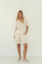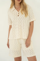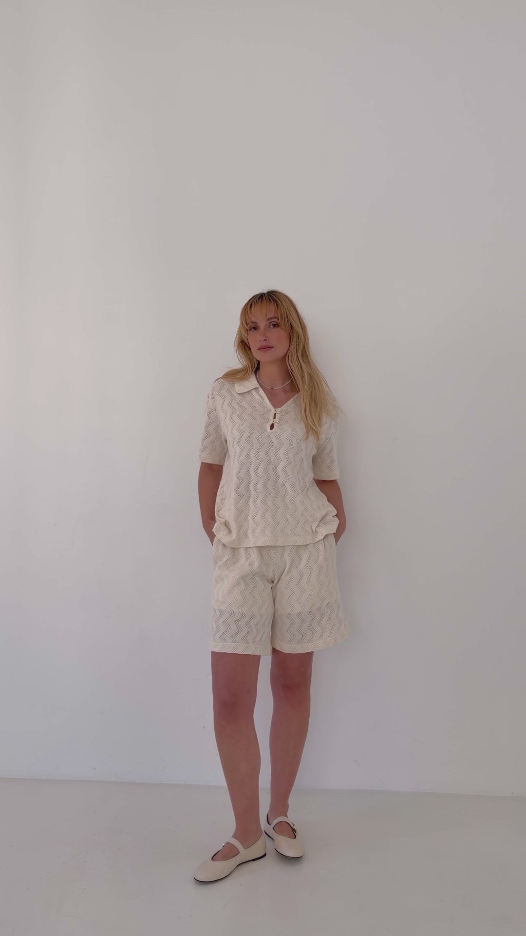 Blusa em malha texturada de toque suave, com manga curta e decote delicadamente ajustável através de dois botões. A gola, com pontas suavemente arredondadas, acrescenta um detalhe elegante à silhueta.