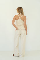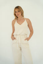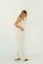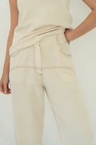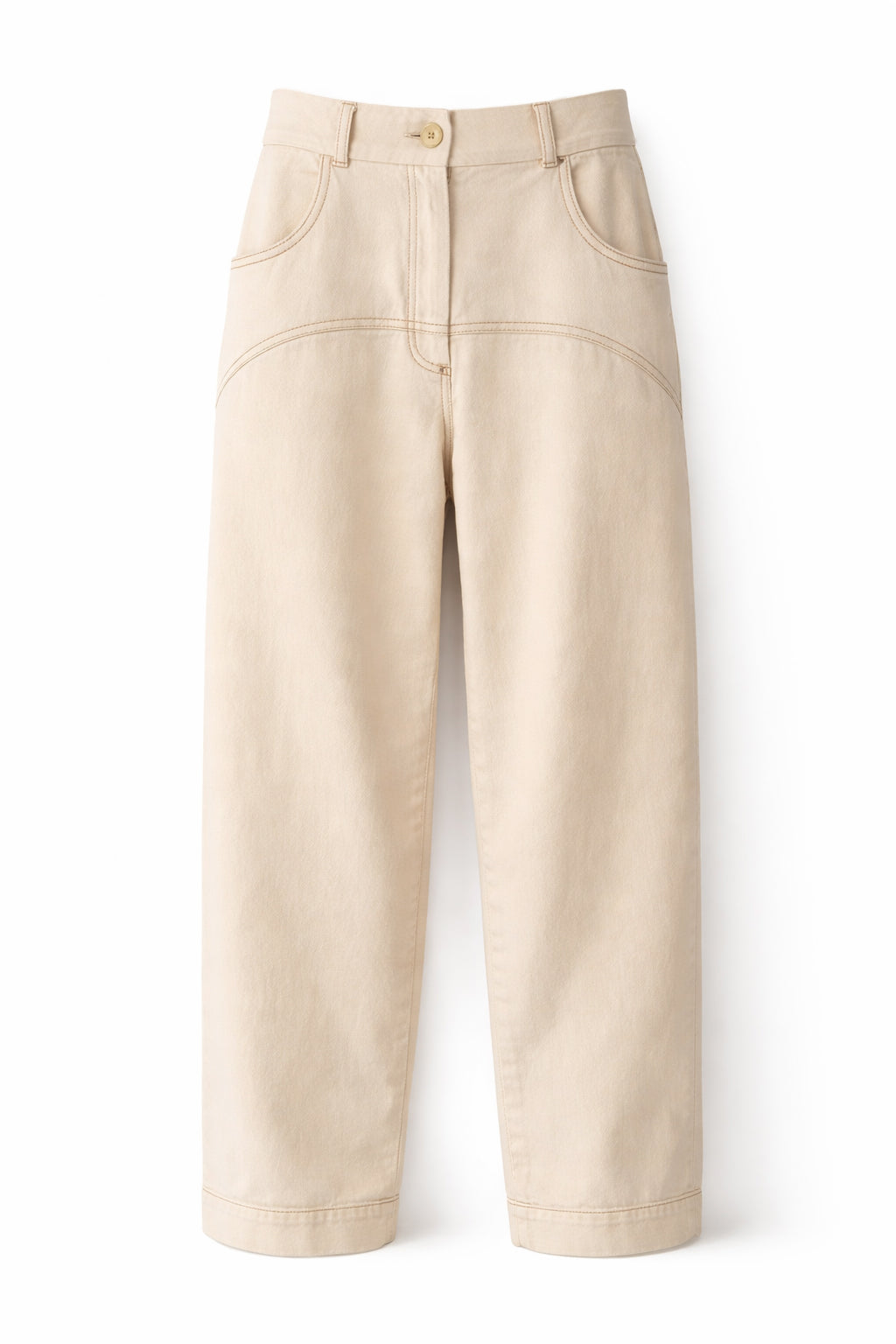 Calças de cintura subida com cós e presilhas, frente com botão e fecho de correr. Apresentam corte direito com perna ampla e comprimento total. O modelo inclui bolsos frontais, mais dois nas costas e detalhes de pespontos contrastantes que valorizam a construção da peça. Confeccionadas em tecido de sarja fluida e leve pela união do liocel ao algodão, proporcionando uma forma elegante e conforto no vestir.