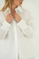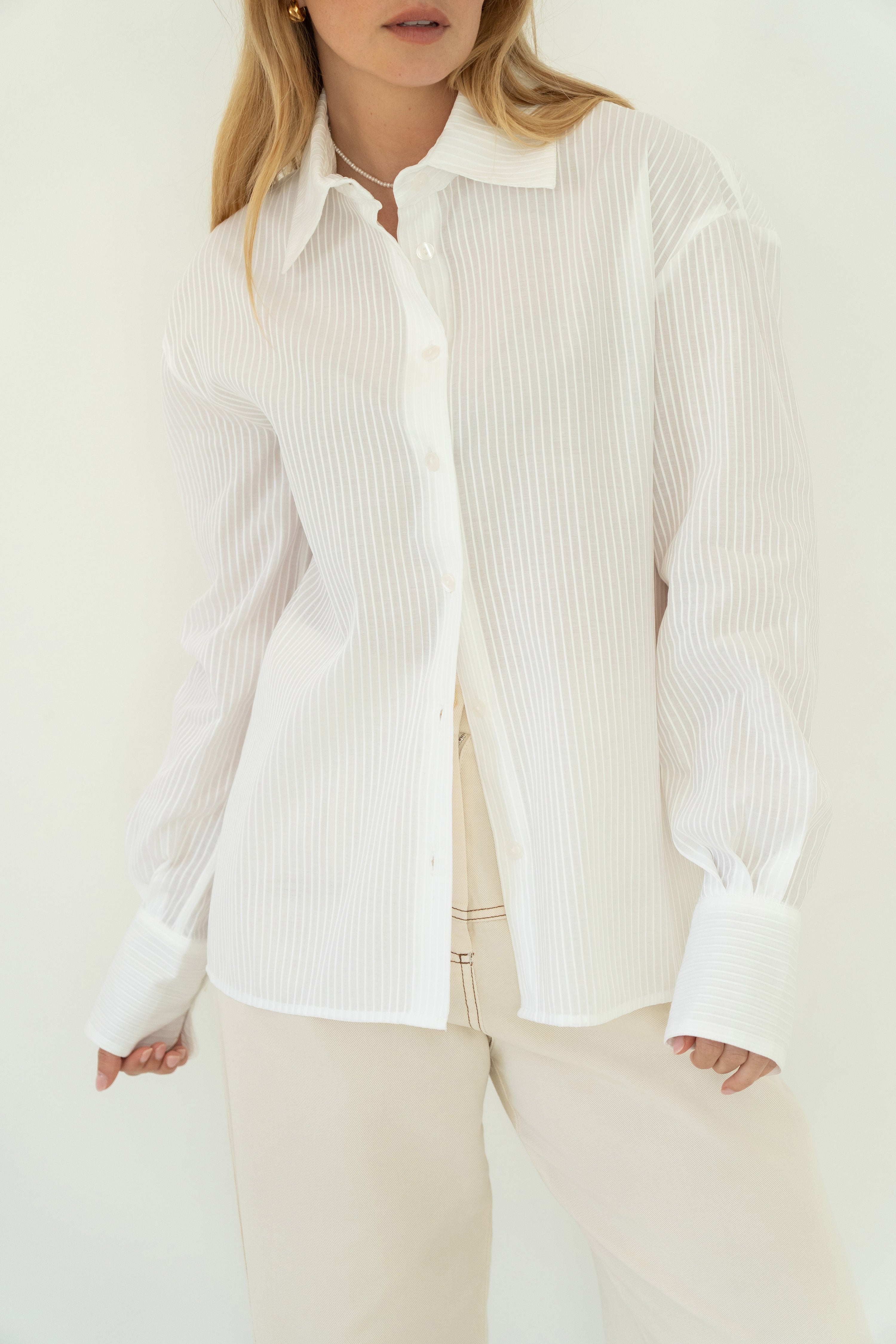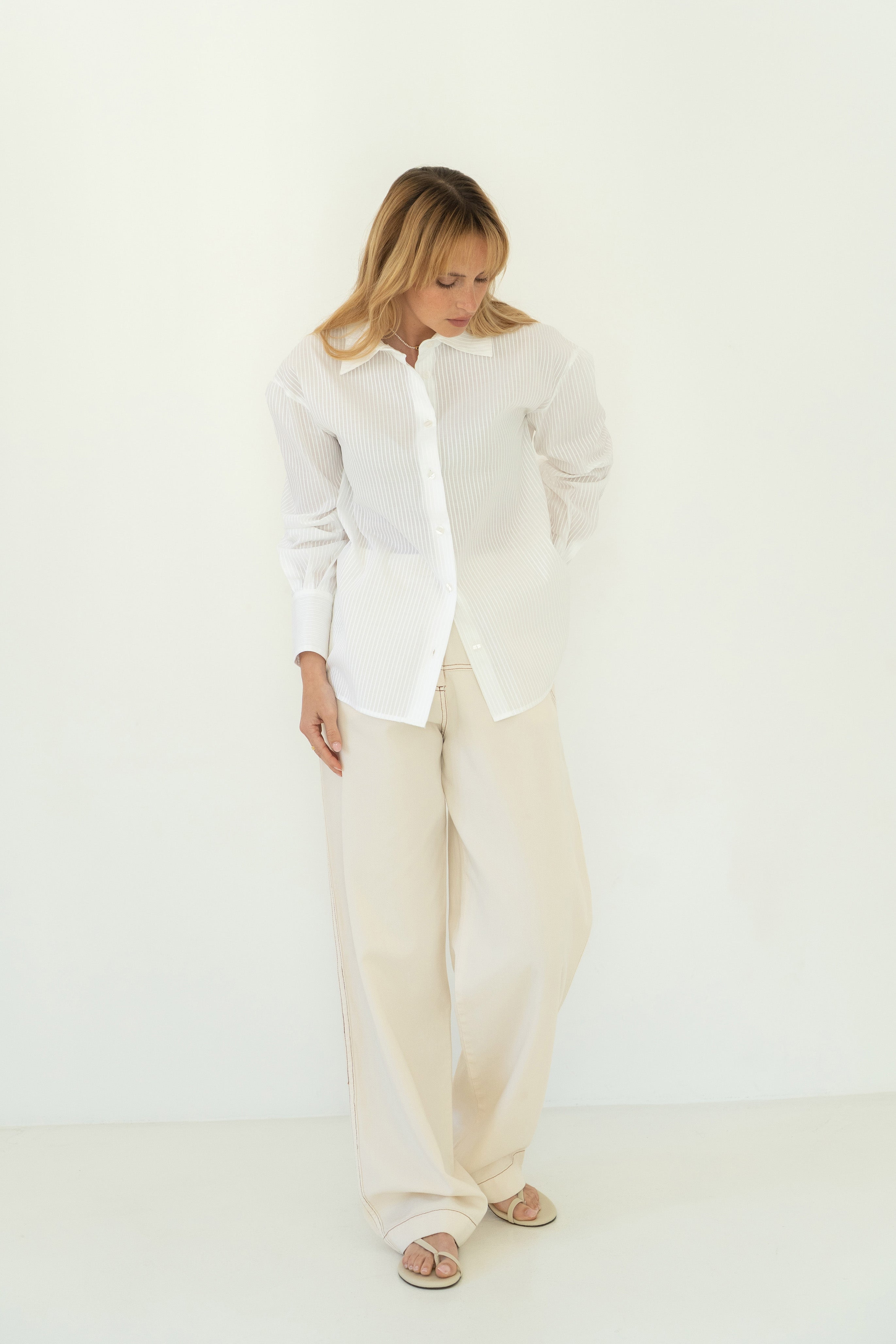 Camisa de corte direito, com colarinho clássico e punhos elegantes. Feita em tecido leve com textura de delicadas nervuras verticais, que confere um relevo subtil e distinção à peça. Modelo versátil, de silhueta harmoniosa, pensado para um uso intemporal.