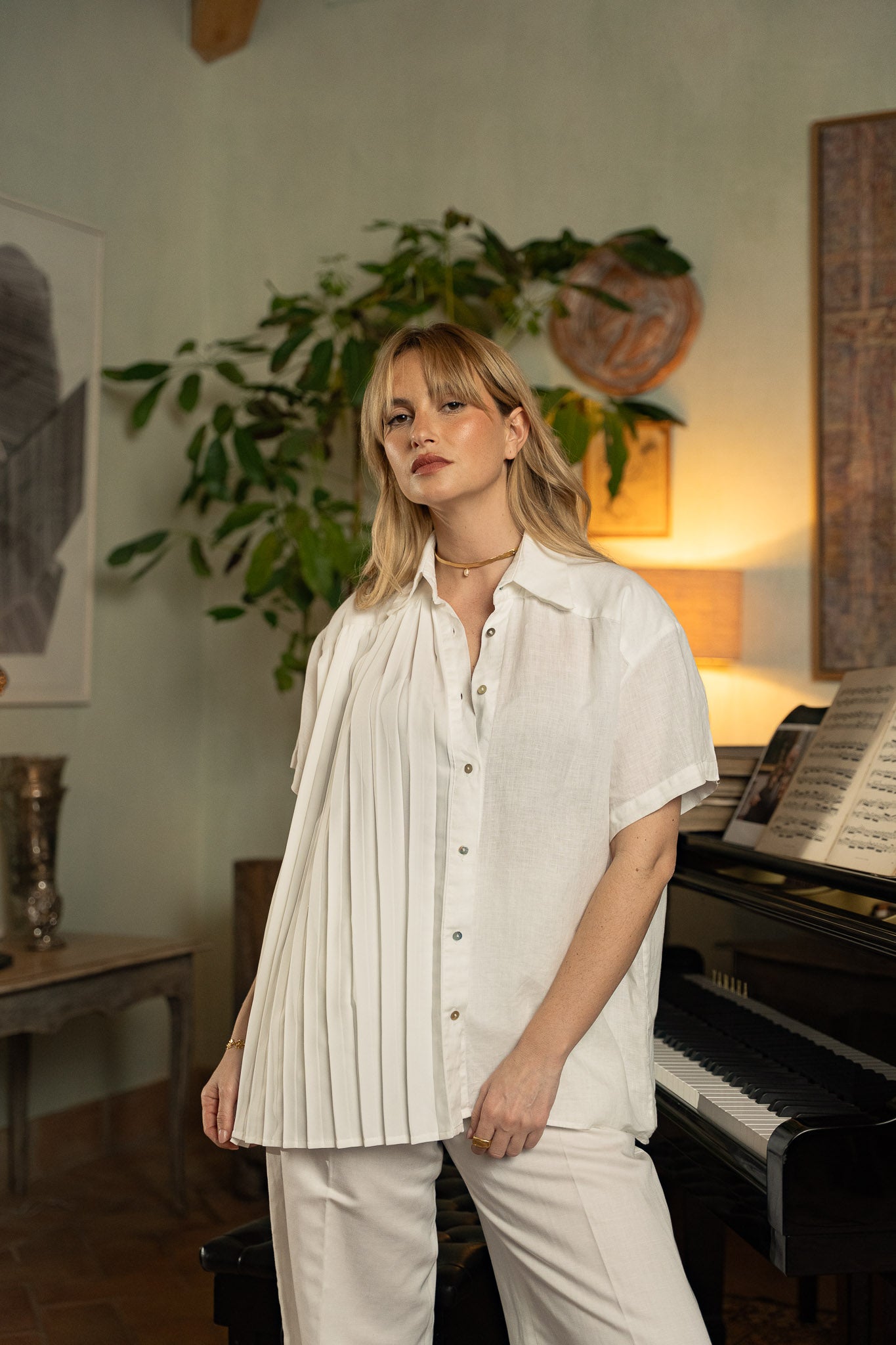 Camisa oversized de design contemporâneo, confeccionada em tecido leve de linho, com toque fresco e caimento fluido. Esta peça destaca-se pelo painel frontal plissado assimétrico, que acrescenta movimento e sofisticação à silhueta minimalista. Possui gola clássica, abotoamento na frente com botões de madrepérola e mangas curtas amplas com uma prega. O comprimento da camisa Ilite reforça o conforto e a versatilidade, permitindo usá-la tanto solta como por dentro para diferentes propostas de estilo.