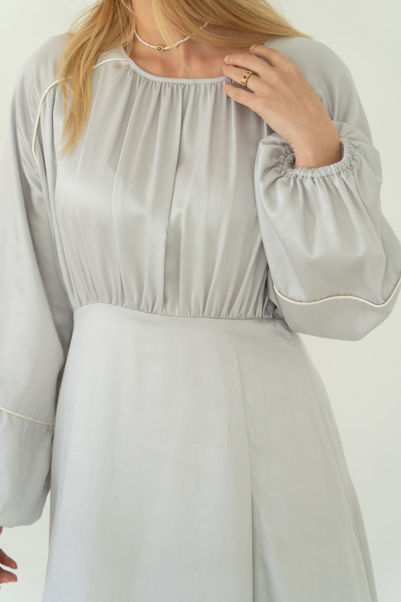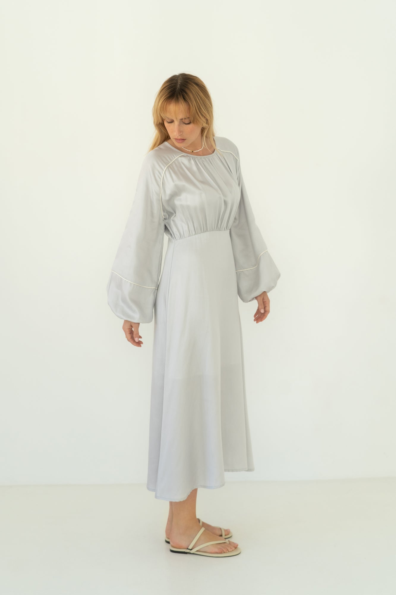 Intemporal e elegante. O vestido Helena feito num tecido ultra suave, esvoaçante com corte imperial, saia midi e uma prega no lado esquerdo da saia dando-lhe personalidade e movimento. Com mangas ligeiramente volumosas e com contraste de contorno em cor branco. Usa-o com ténis ou sapatos rasos para um estilo descontraído ou com saltos altos para um look de festa.