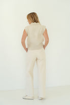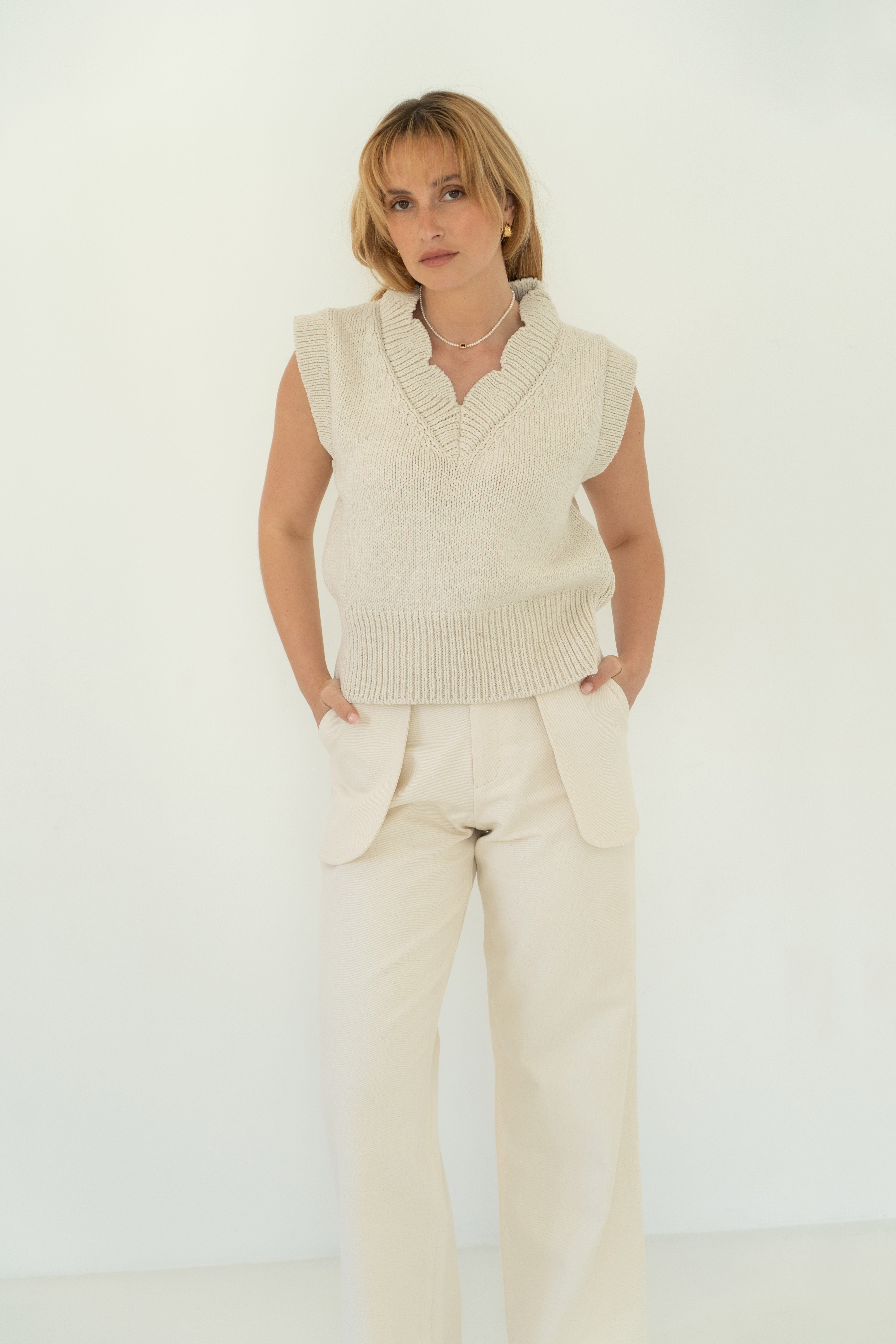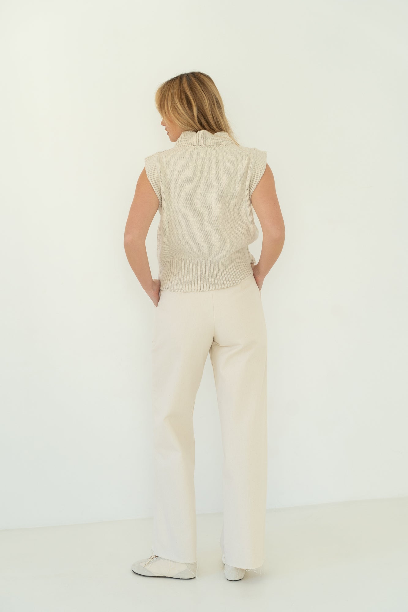 Calças de cintura subida com cós estruturado e fecho frontal. Apresentam corte direito com perna ligeiramente ampla, proporcionando uma silhueta elegante. O modelo inclui bolsos frontais aplicados com fundura curva e é confeccionado em tecido de sarja tipo jeans em 100% algodão orgânico. Estilo único e distinto.