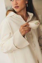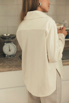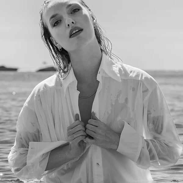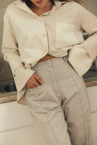 Com um design de suave contraste de materiais, tons e texturas, a camisa BIA surge num estilo casual e descontraído, assim como, sofisticado e elegante. Tem punhos longos que podem ser virados para cima e botões feitos de algodão reciclado.