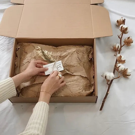 A nossa embalagem é feita em caixas de papel reciclado, restos de papel que temos no nosso atelier provenientes dos nossos fornecedores e que reaproveitamos, dando-lhes uma nova vida.