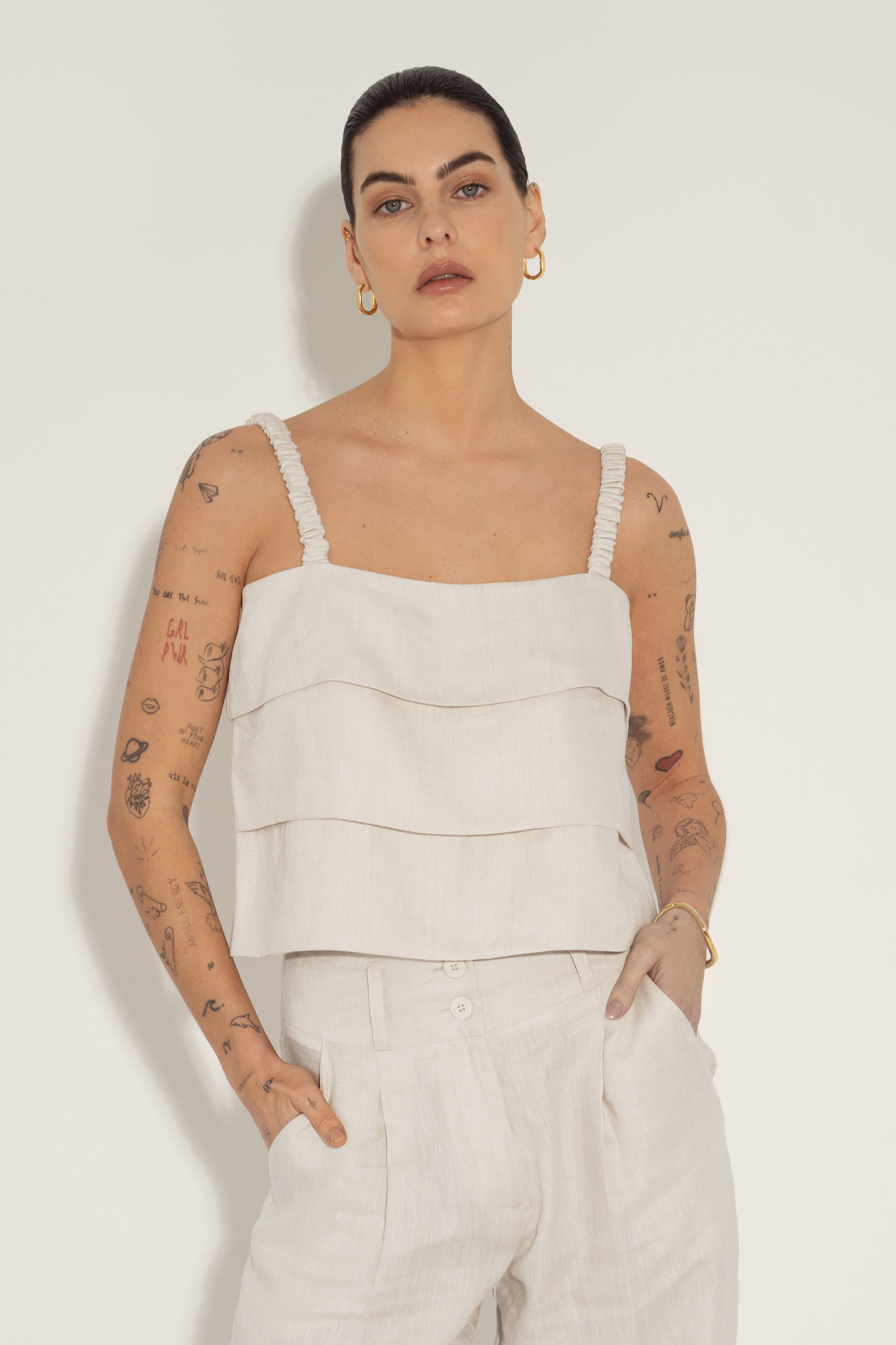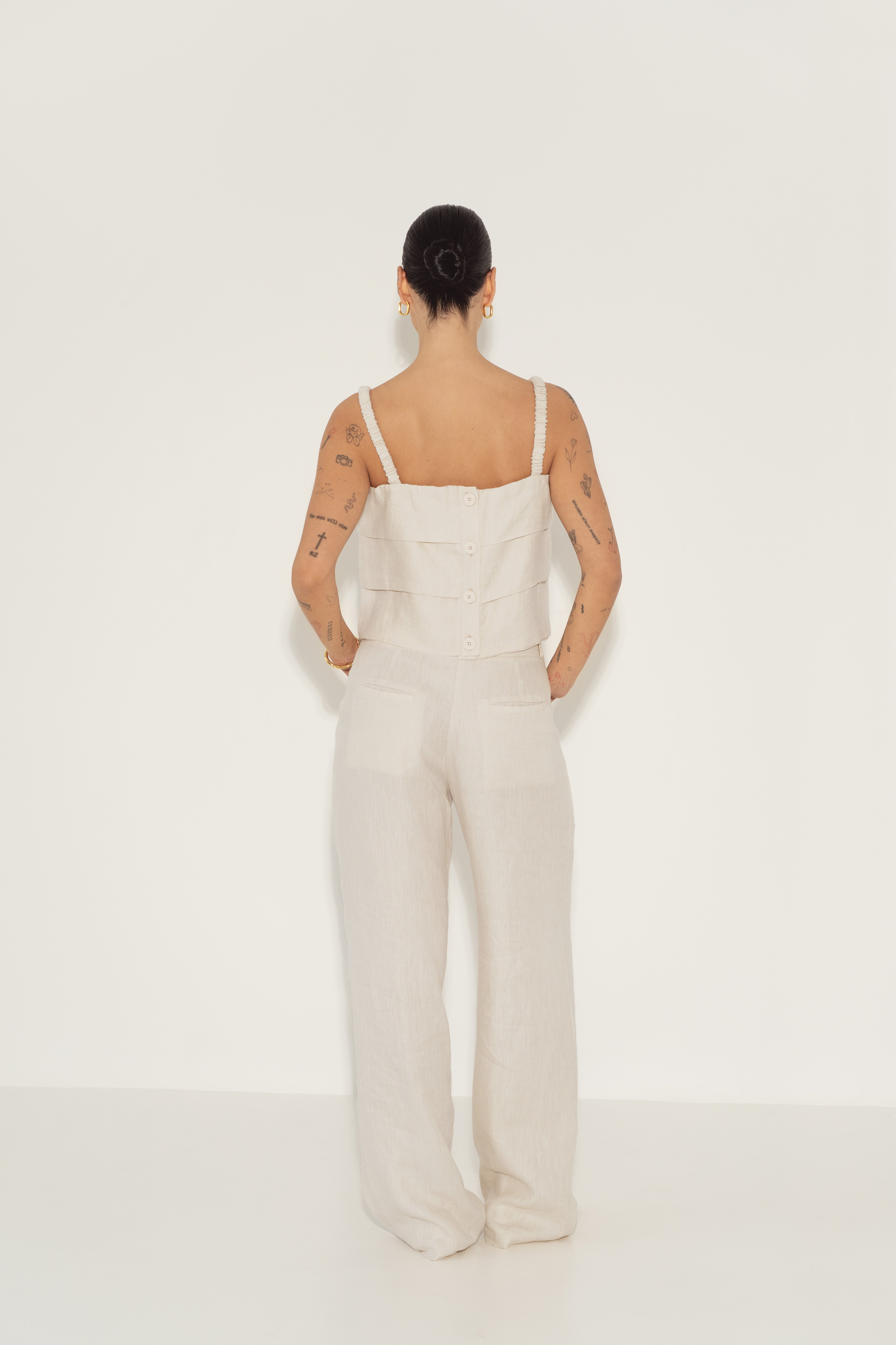 Calças longas e fluidas feitas em 100% linho extra suave. Esta peça tem duas pregas na frente e 4 bolsos, dois na frente e dois nas costas. Apresenta-se com cós alto e dois botões na frente, proporcionado uma silhueta elegante. Para efeito look total, usa-as com o top Hibisco.