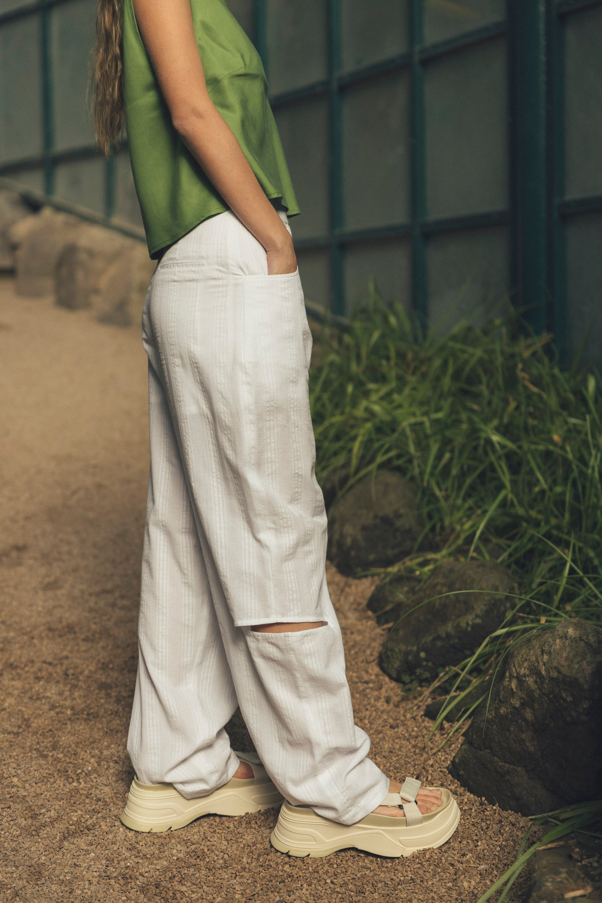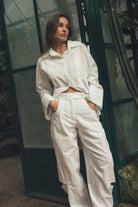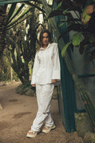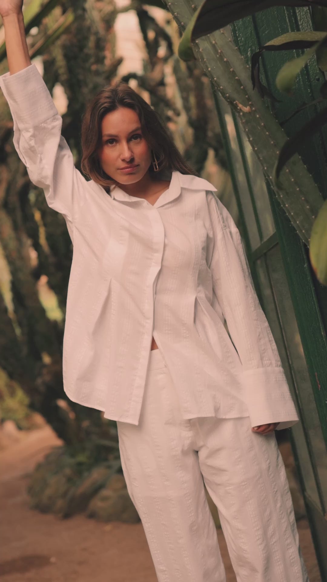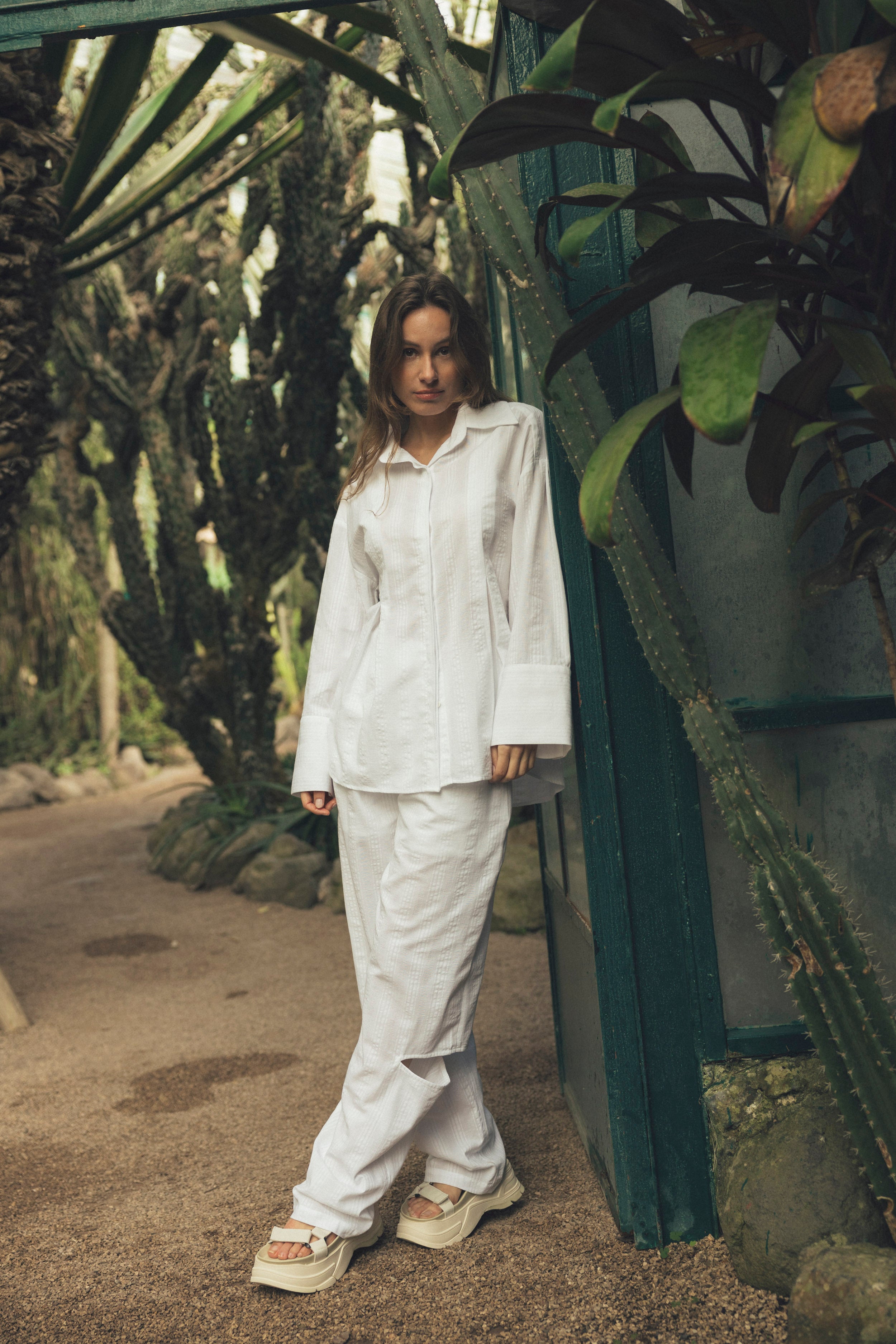 Desenhadas num suave tecido de algodão bordado, as calças FRÉSIA, com um estilo clássico, descontraído e com detalhes únicos de pequenas aberturas laterais. Tem dois bolsos de lado e são forradas no interior. Para efeito look total usa-as com a camisa JASMINE.