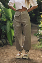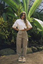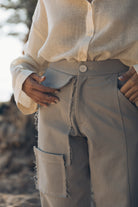 Calças em sarja de algodão - denim. Com frentes assimétricas e bolsos exteriores com costuras ao natural, conferindo-lhe um estilo próprio. Elástico ajustável no tornozelo. Esta peça assenta e adapta-se muito bem ao corpo.