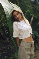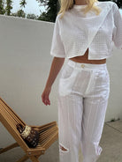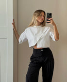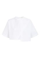 O top com mais estilo. Em formato curto e assimétrico, esta peça foi desenvolvida com 100% algodão leve e fresca para a pele, num tecido bordado com textura. Destaque o seu comprimento curto usando-o com saias e calças de cintura subida. Para um conjunto completo, use-o com a saia LISA.