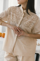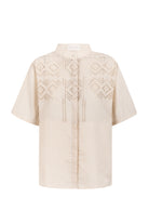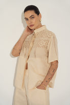 A camisa Agave vem para dar um toque de delicadeza aos teus looks. Apresenta-se com manga curta, e com metade da peça em tecido liso, outra metade em tecido bordado. Carcela com botões por dentro.