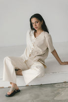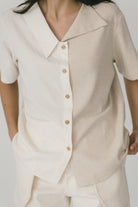 A Margarida é feita com a conjugação de dois materiais diferentes e botões de madeira de Oliveira, apresenta mangas curtas e podes usá-la por dentro ou solta para um estilo mais descontraído.