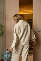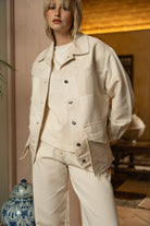Blusão em tecido estruturado, de corte ligeiramente amplo, apresenta colarinho clássico, abotoamento frontal com botões metálicos e bolsos de aplicação que reforçam o seu carácter funcional. A bainha com acabamento subtilmente desfiado acrescenta textura e autenticidade à peça. Ideal para sobreposições elegantes, equilibra estrutura e leveza numa silhueta intemporal e sofisticada.