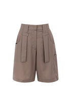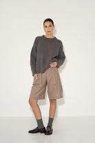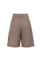 Calções em 100% lã merino extra fina, proporcionando uma leveza e fluidez na peça, onde o conforto se alia à elegância e cada detalhe importa. Tem dois bolsos nas laterais e um bolso com prega em estilo cargo. O cós fecha com um gancho metálico interior, conferindo um exterior liso livre de botões. Tem presilhas, podendo assim ser usado um cinto e umas fitas/ presilhas soltas na frente feitas do próprio tecido.