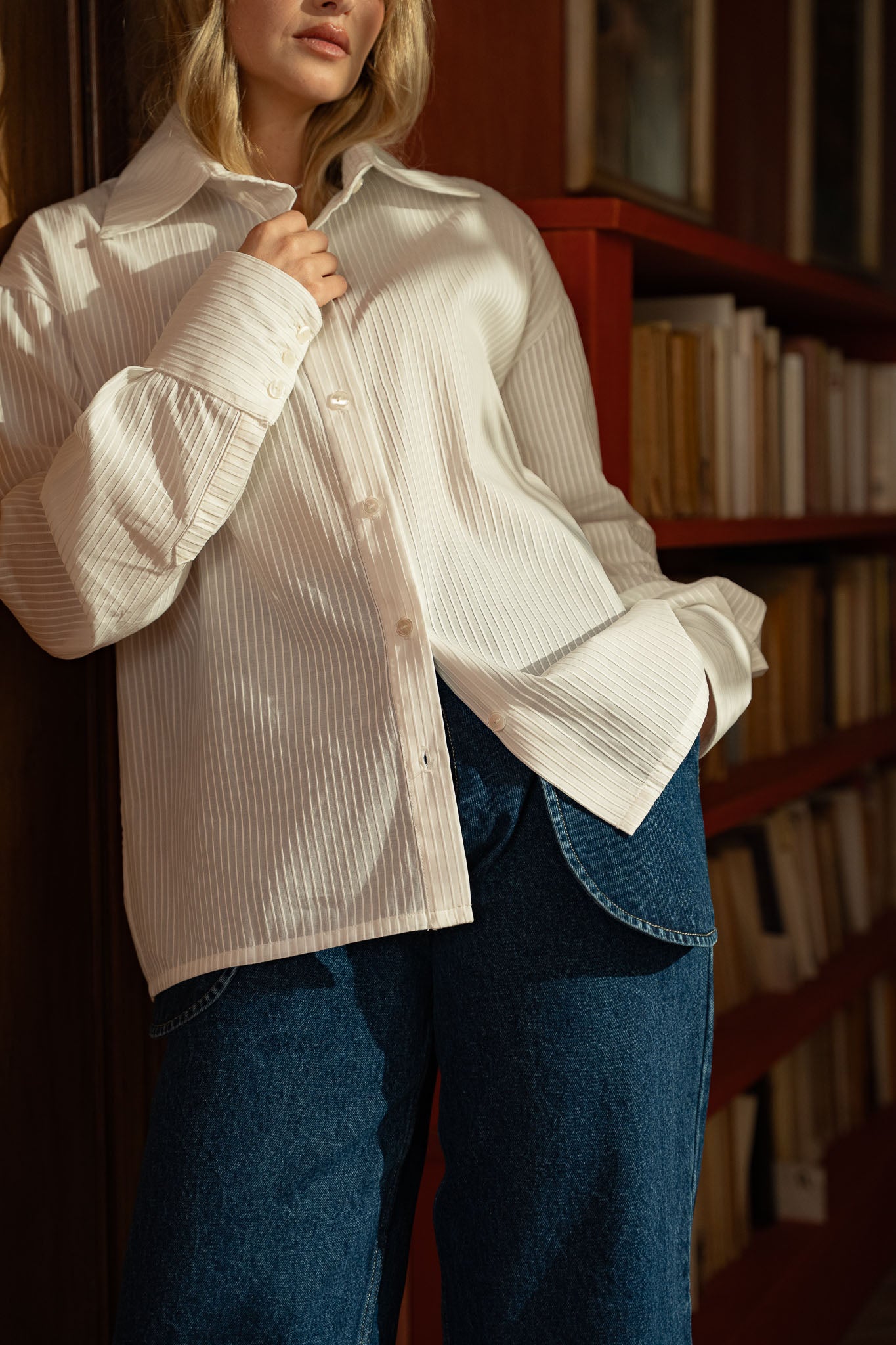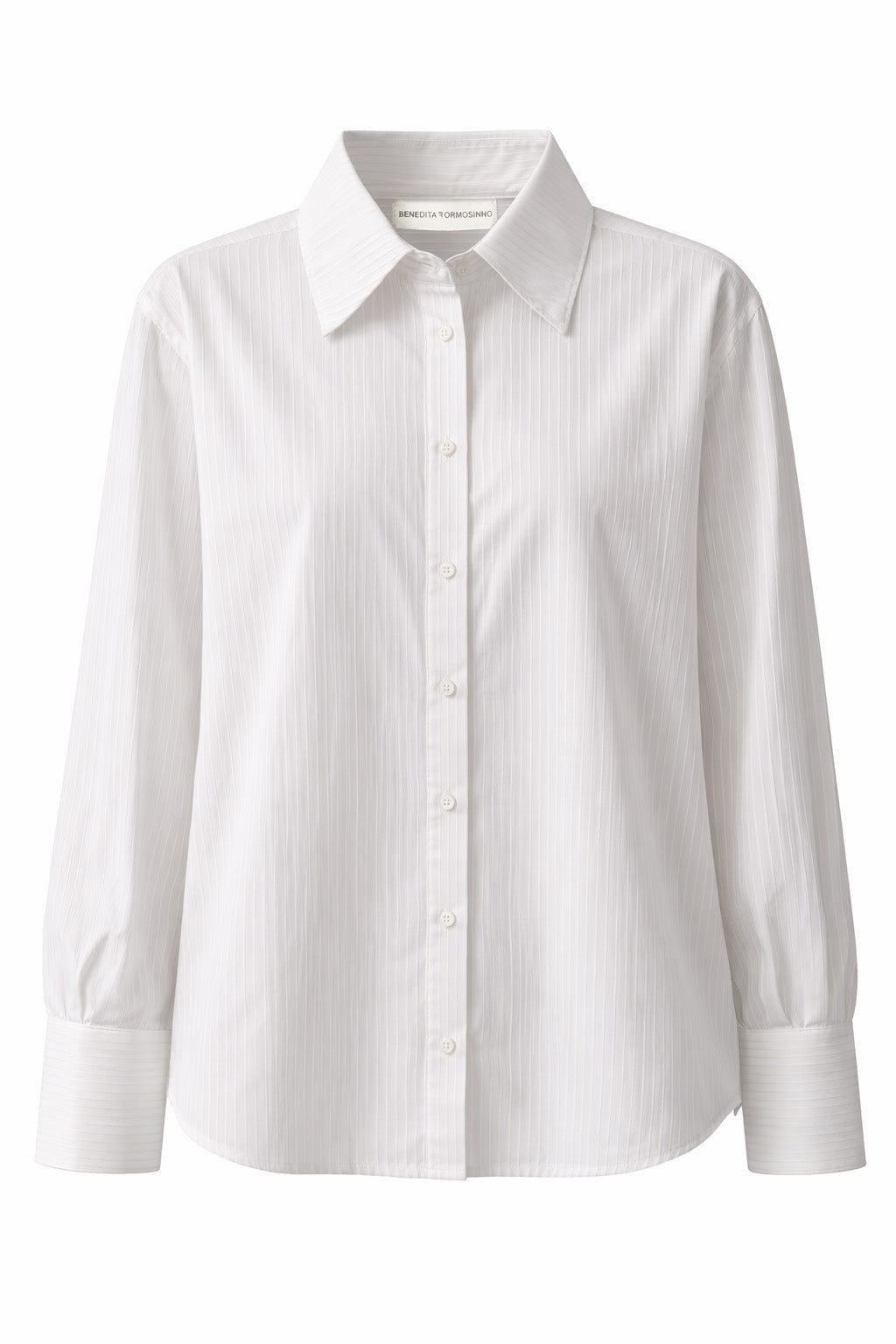 Camisa de corte direito, com colarinho clássico e punhos elegantes. Feita em tecido leve com textura de delicadas nervuras verticais, que confere um relevo subtil e distinção à peça. Modelo versátil, de silhueta harmoniosa, pensado para um uso intemporal.