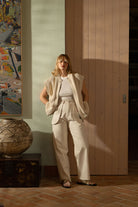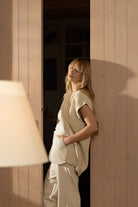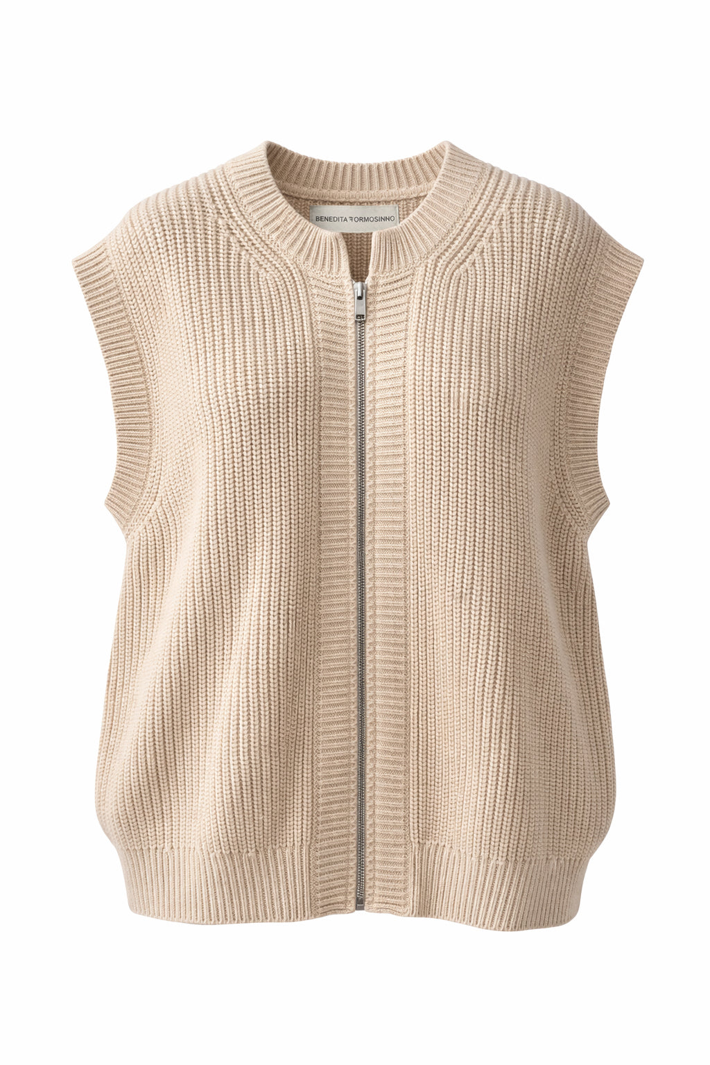 Colete em malha cuidadosamente tricotada em fio 100% algodão orgânico, com corte amplo e ombro ligeiramente descaído. Apresenta gola redonda e fecho frontal metálico integrado numa silhueta elegante e contemporânea. A malha estruturada confere forma e presença, mantendo conforto e fluidez no uso, enquanto os acabamentos canelados no cos e nas cavas reforçam a definição da peça.