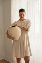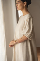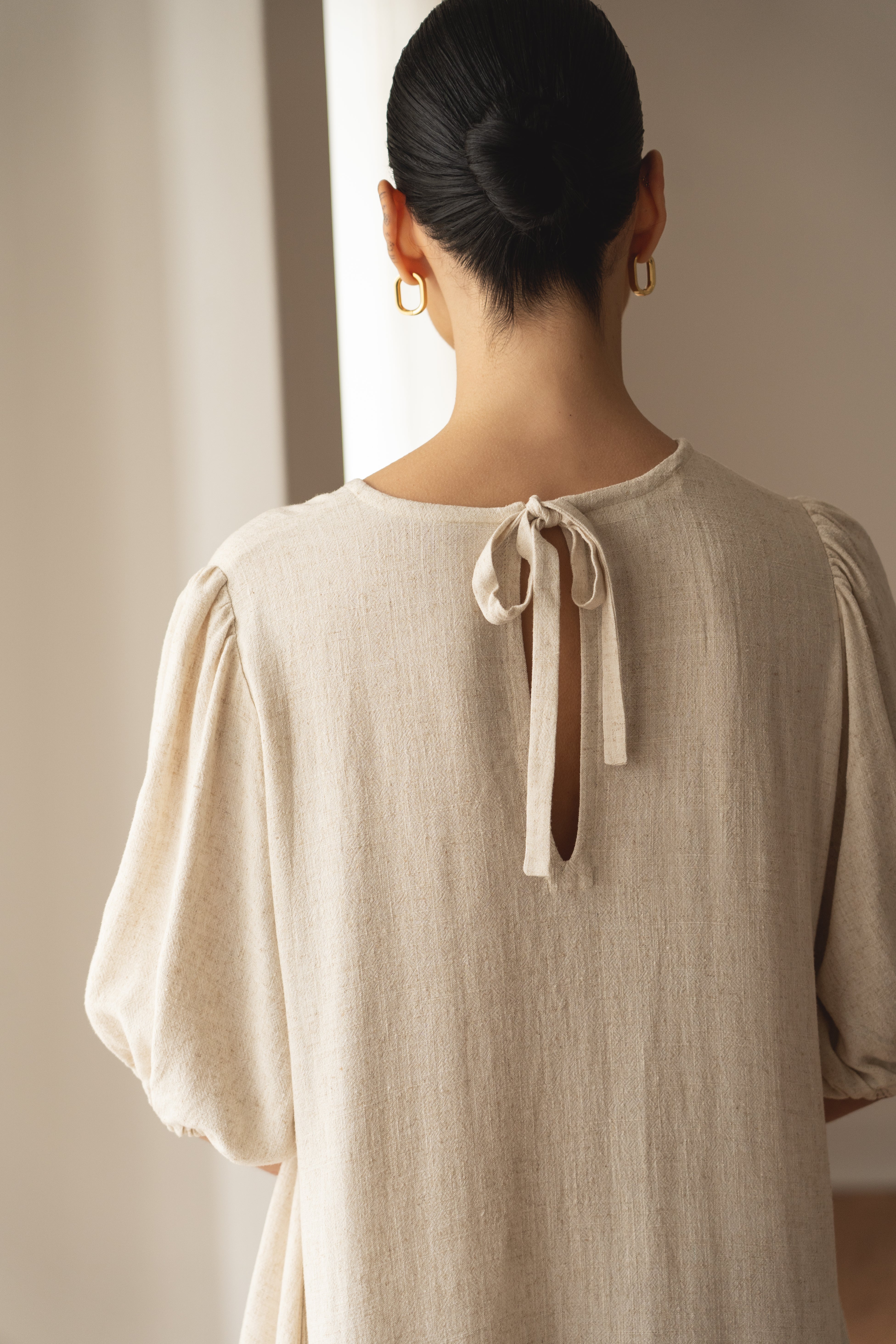 Vestido em linha A, leve e elegante, com uma prega na frente. Estilo fluido e intemporal. Tem dois bolsos na lateral e o decote pode ser ajustado nas costas com duas fitas na zona do pescoço. Manga com elástico proporcionando um ligeiro efeito balão.
