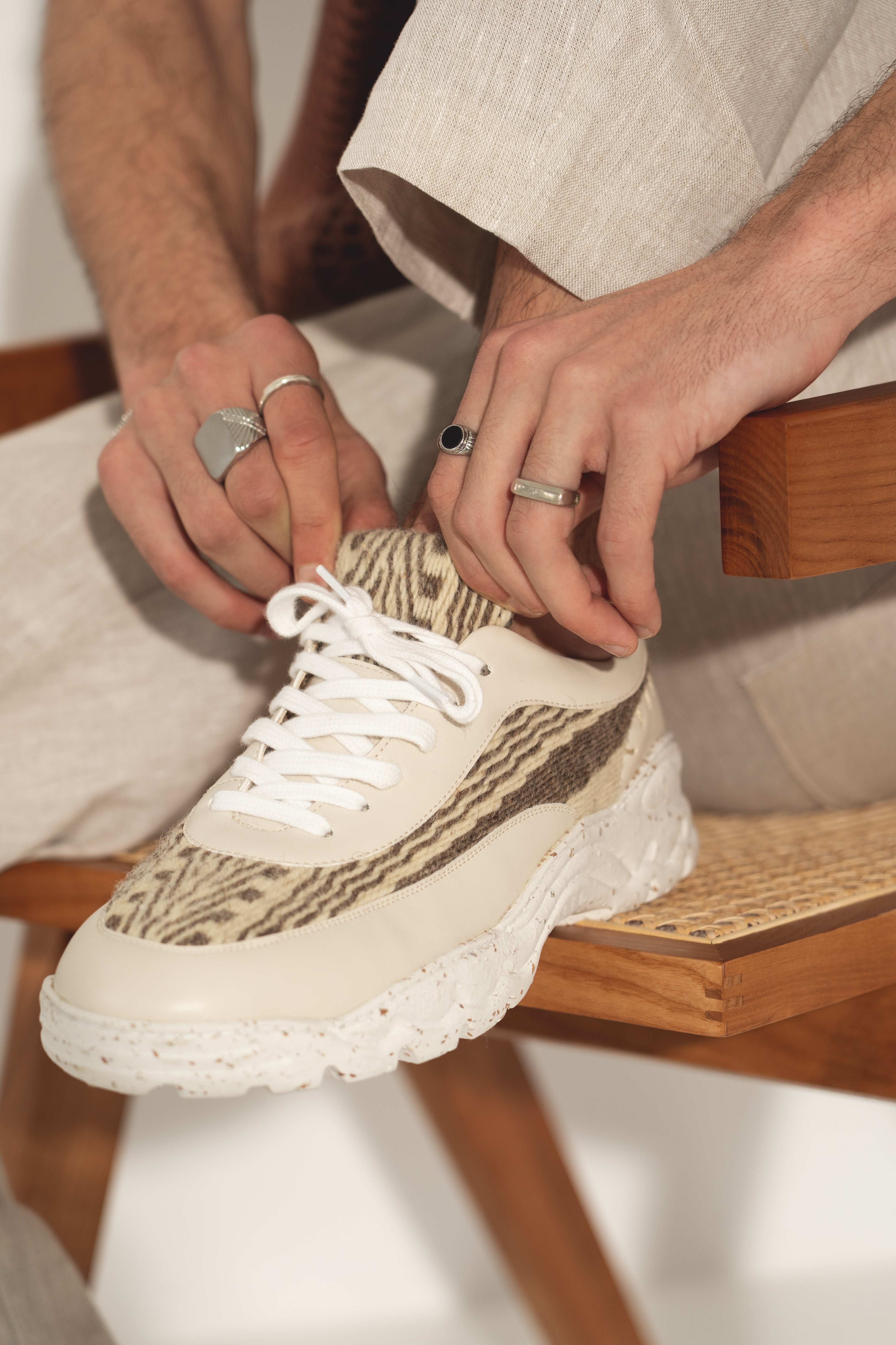 On a journey to the Origins filled with inspiration and emotion, our curiosity for what is done with our hands and our awareness of what we want to add led us to this Shoe. As materials often define the measure of what is created, seeing the looms at work up close served as inspiration for the entire process.