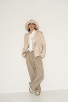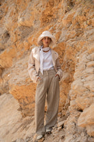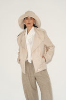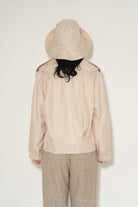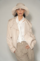A lightweight, water-repellent jacket with effortless style. Featuring oversized lapels and collar for a distinctive look, it fastens with two statement buttons and includes side pockets for practicality. Two back pleats add a subtle, tailored shape, while the collar can be lifted on rainy days for extra comfort and protection. A versatile piece that blends elegance with functionality.