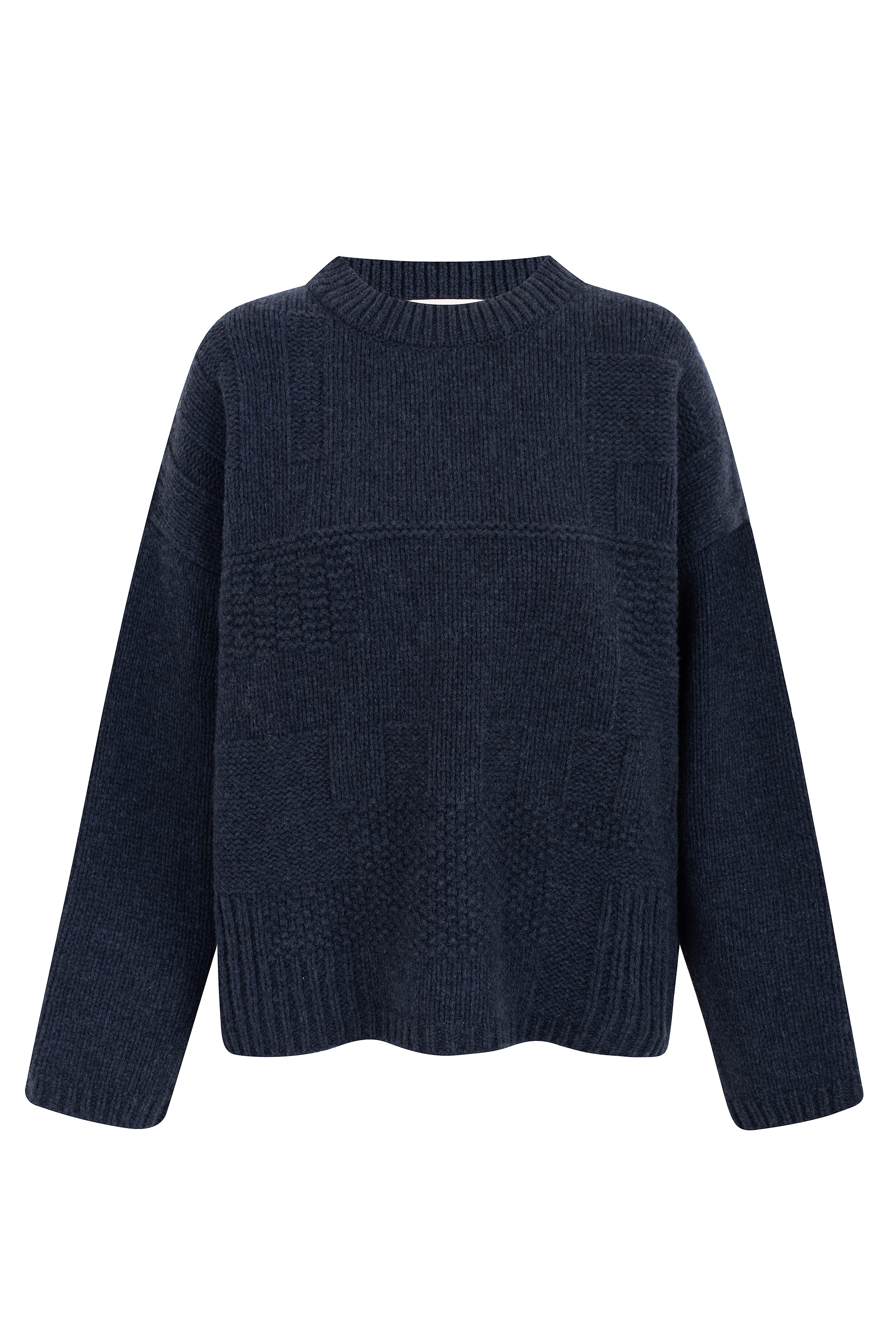 The most cozy sweater ever! Crafted from certificed merino wool, feutaring rew-neck sweater and long sleeves. With a design between different stitches, textures and asymmetries. This piece is very light and soft, providing all-day comfort.