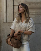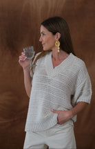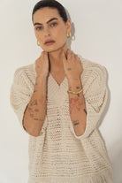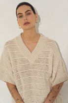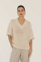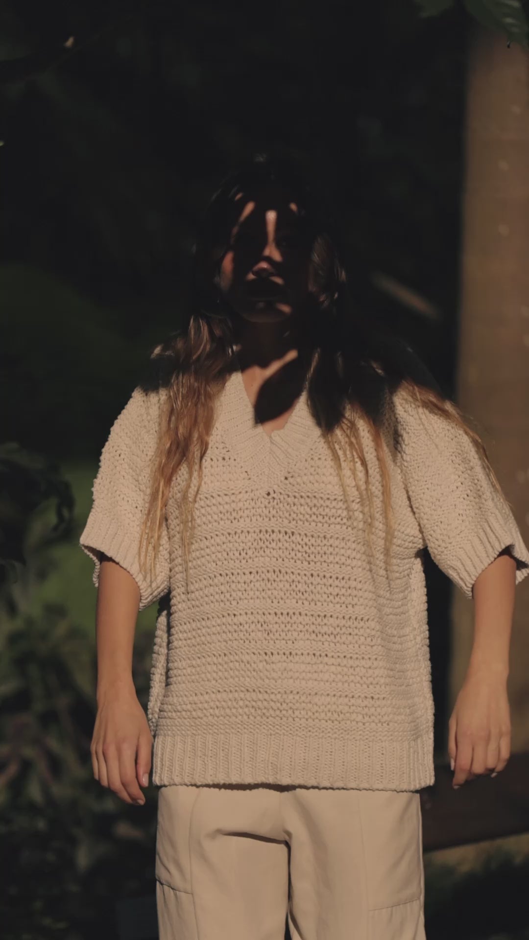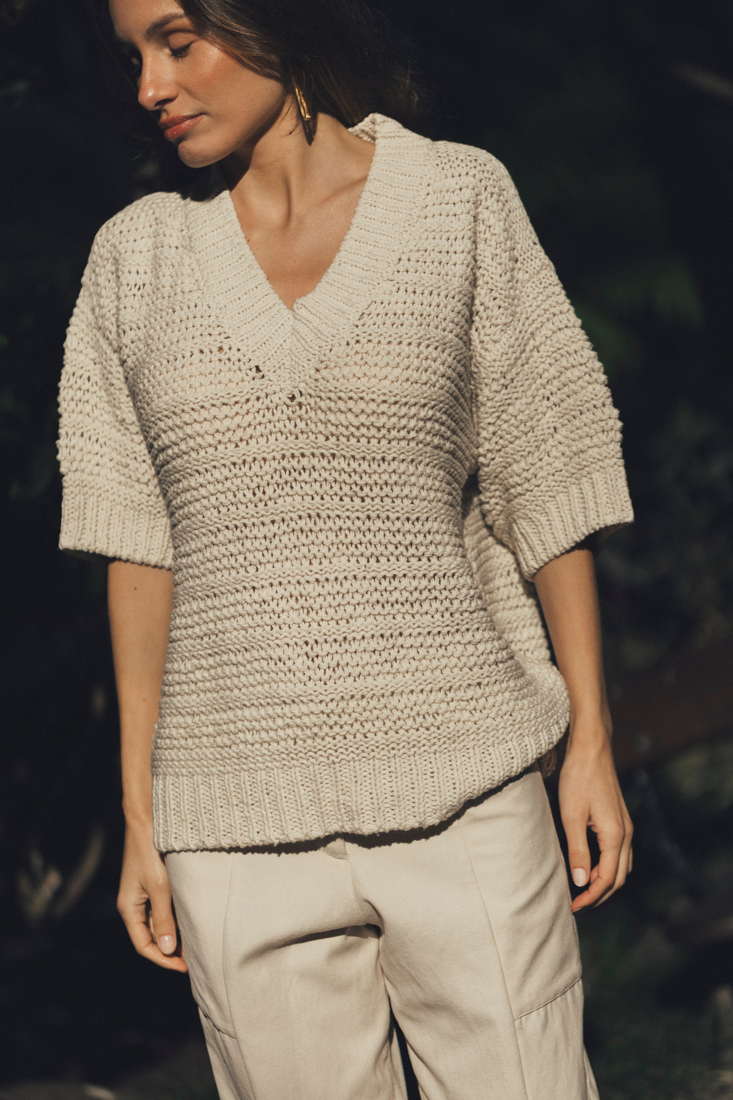 BeneditaFormosinho knitwear is designed with a minimalist design with special detail and high quality materials. In this cream colour, V-neck sweater is made from 100% recycled fiber (70% waste + 30% recycled lyocell). Relaxed style with lower shoulders that create a subtly rounded and elegant shape.