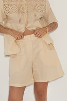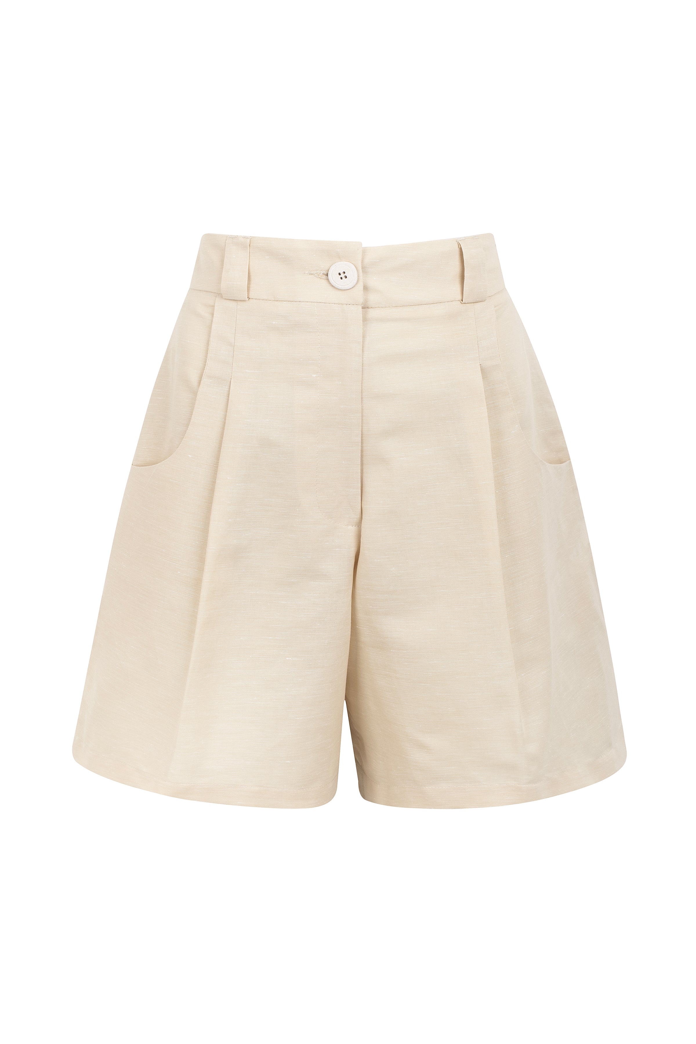 Shorts with a slight balloon effect, provided by the design and material chosen for this piece. It has a high waist and wide belt loops, zip fastening, two pleats and pockets on the front. For a total look, wearing with the AGAVE shirt.