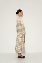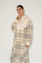 Midi A-line skirt in checkered fabric. Two large front pockets, wide belt that gives this piece a distinctive design. Loose lines for an elegant style.